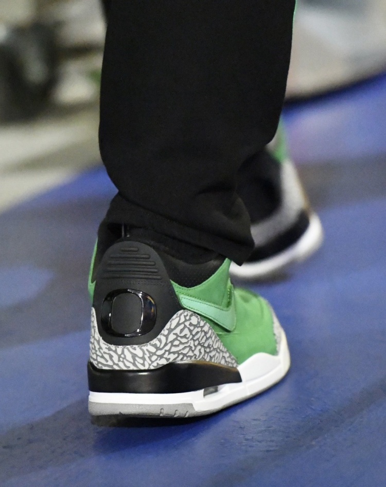 Trước trận đấu, Curry mang giày thể thao Air Jordan 3 PE cổ điển màu Oregon.